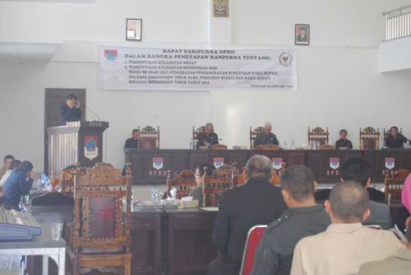 ADVERTORIAL, BOLTIM – Dewan Perwakilan Rakyat Daerah (DPRD) Bolaang mongondow Timur (Boltim) hari ini jumat (15/01) Menggelar paripurna di kantor DPRD Boltim, dalam rangka penetapan Rancangan peraturan daerah (Ranperda) tentang pembentukan kecamatan Mooat, kecamatan Motongkad 2016, dan pengumuman usul pengesahan pengangkatan Bupati dan Wakil Bupati Boltim dari hasil pilkada 2015.