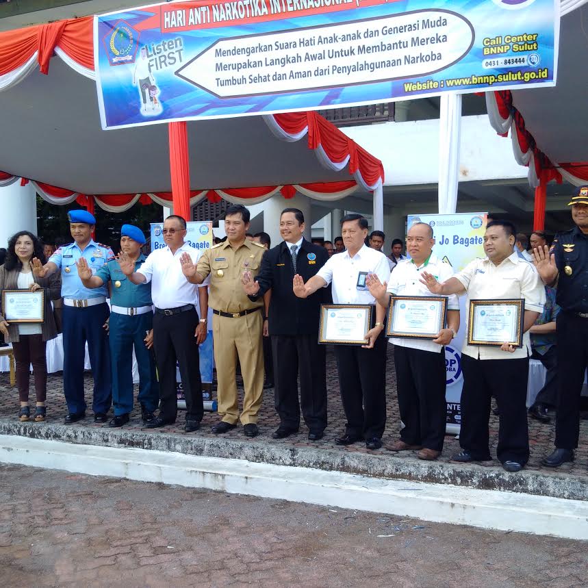 TOTABUANEWS, MANADO – Badan Narkotoka Nasional Kabupaten (BNNK) Bolaang Mongondow menghadiri upacara peringatan Hari Anti Narkoba Internasional (HANI). Kegiatan yang dilaksanakan di halaman Kantor Gubernur Sulut dihadiri oleh peserta personil BNK, BNN Kabupaten/Kota, BNNP, PNS, Pihak Polrri, TNI dan beberapa peserta lainnya. Kegiatan dengan mengangkat tema ‘Listen First’ (Mendengarkan suara hati anak-anak dan generasi muda merupakan langkah awal untuk membantu mereka tumbuh sehat dan aman dari penyalahgunaan Narkoba), dipimpin oleh Wakil Gubernur Sulut Steven Kandow.