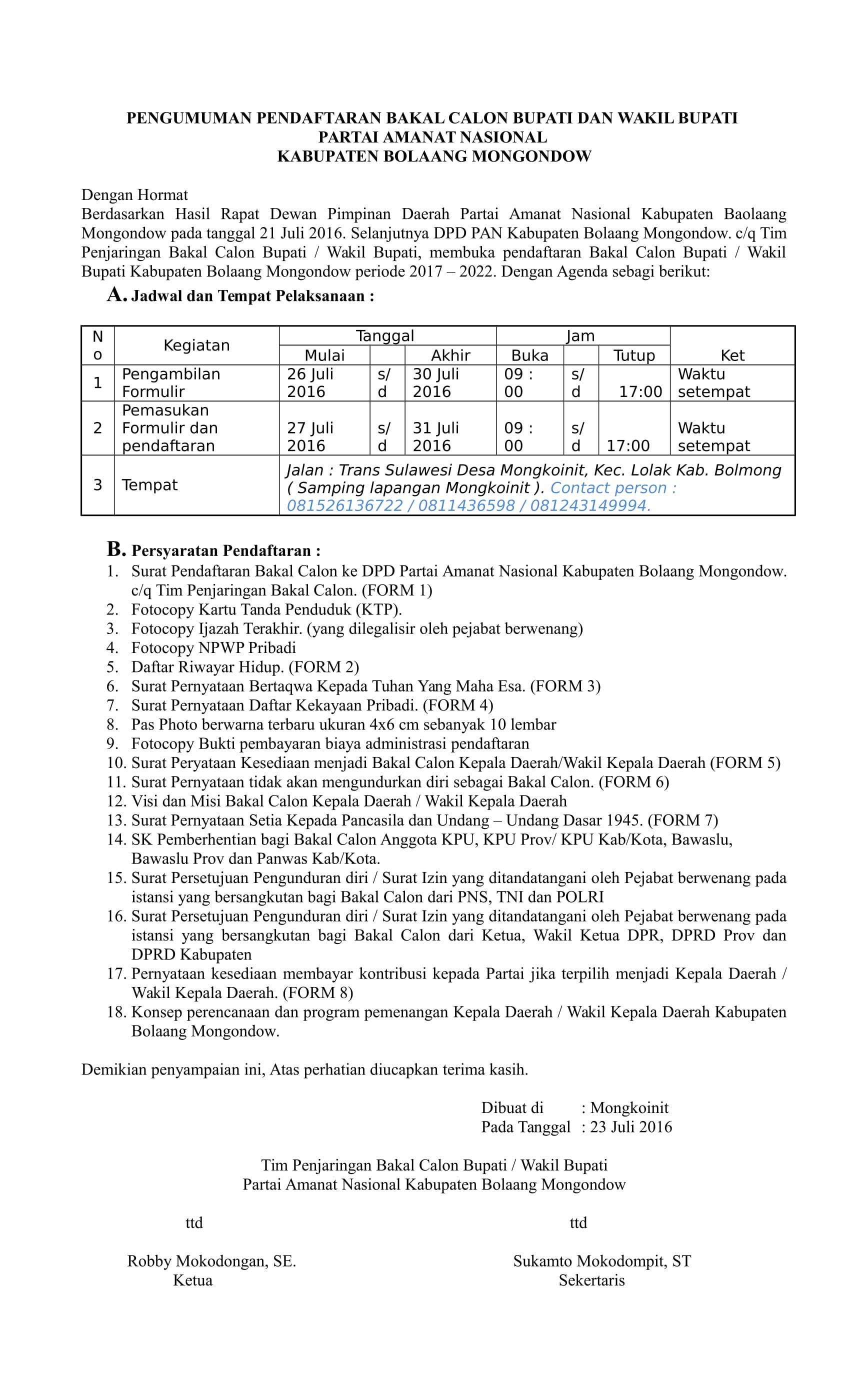 PAN Bolmong Buka Pendaftaran Bakal Calon Bupati, Ini Persyaratannya Senin, 25 Juli 2016oleh Redaksi-91 Dilihatoleh Redaksi Post Views: 91 Jangan LewatkanDugaan Penyimpangan Rp1,1 Miliar di Medan Fashion Festival, Dua Pejabat Jadi TersangkaTerungkap! Undangan Pelantikan Pejabat Pemko Binjai hanya Lewat WhatsAppPolemik Pelantikan Pejabat di Pasar Tavip : Pemko Binjai Dinilai Langgar Aturan KeprotokolanLSM LIRA Tuntut Klarifikasi Pemerintah Kota Binjai soal Pelantikan di PasarPelantikan Pejabat Eselon II Pemko Binjai di Pasar Tavip Berpolemik
