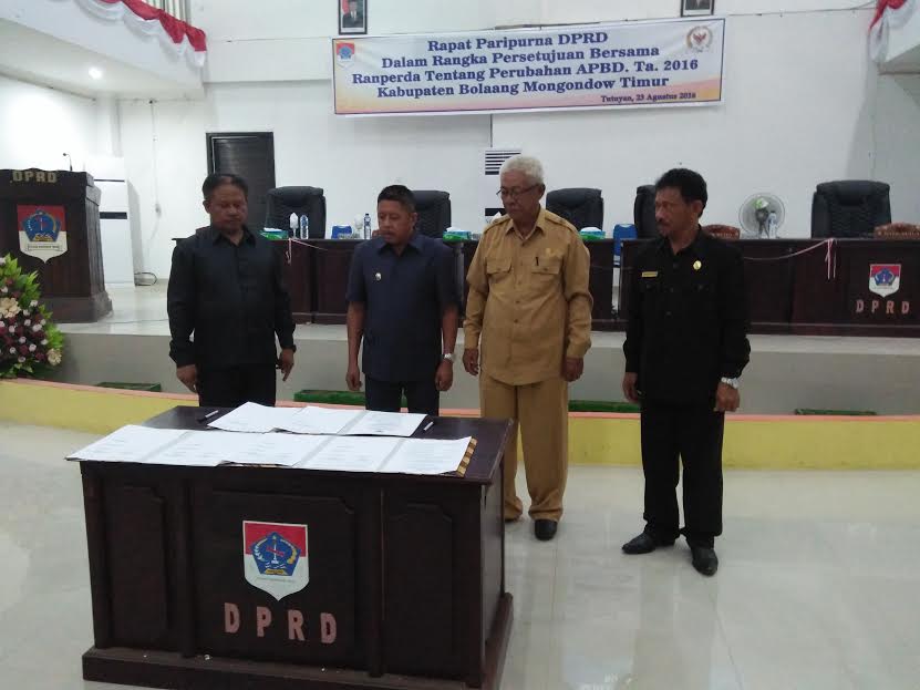 Persetujuan APBD-P tersebut dibacakan oleh Wakil Bupati Boltim, yang disaksikan oleh seluruh anggota DPRD Boltim, yang sekaligus langsung di tandatangi oleh Ketua DPRD Boltim Marsaole Mamonto dan wakil Bupati Boltim Drs Rusdi Gumalangit. pada sidang paripurna tersebut, seluruh DPRD melalui Ketua Dewan Menyetujui dan menetapkan Ranperda APBD-P tahun 2016, “Ranperda APBD-P sudah didisetujui bersama, selanjutnya kita tinggal mengajukan ke Provinsi untuk di evaluasi,” kata Ketua Dewan.