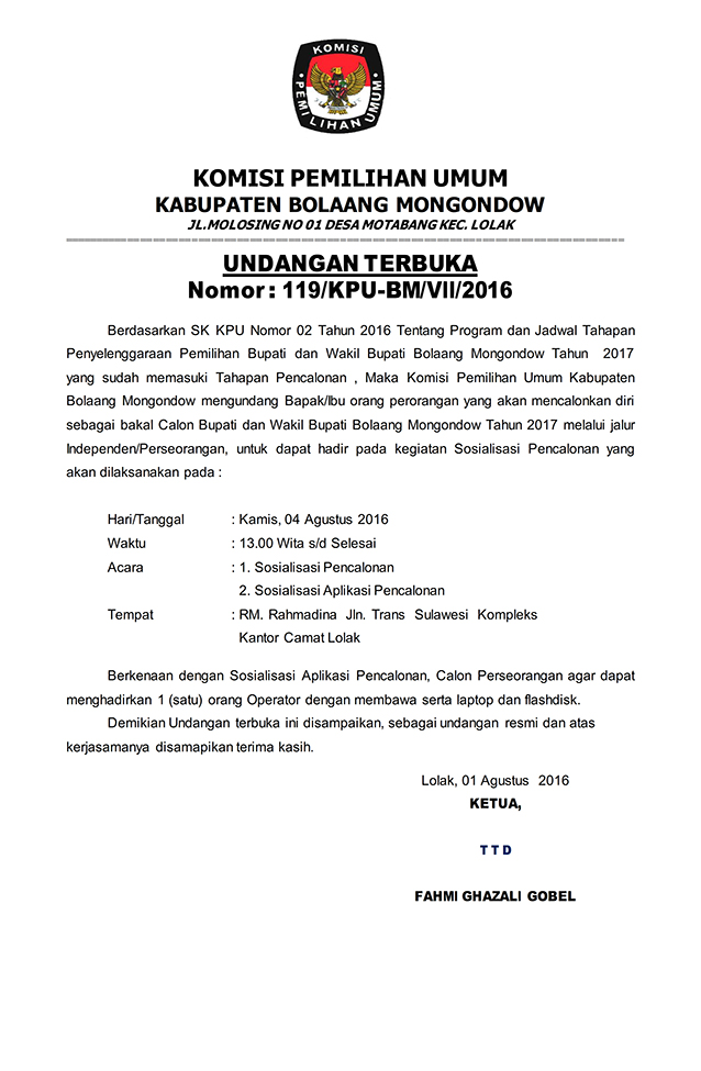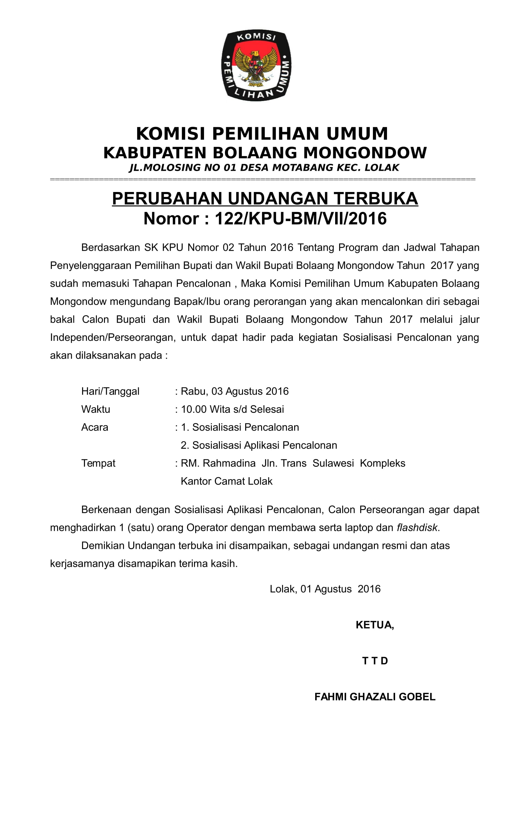 TOTABUANEWS, BOLMONG – Komisi Pemilihan Umum (KPU) Kabupaten Bolmong pada Kamis pekan ini akan menggelara sosialisasi untuk pencalonan melalui jalur independen. Untuk itu pihak KPU mengundang seluruh bakal calon Bupati agar menghadiri kegiatan tersebut. Ini undangannnya :
