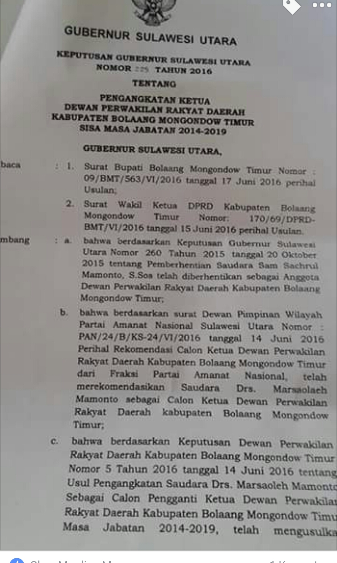 Saat dikonfiormasi, Marsahaole Mamonto membenarkan kalau Ia telah mengantongi SK dari Gubernur. “SK sudah saya terima dari asisten satu Pemprov Sulut bapak Jhon Palandung kemarin,” ujar Politisi Partai Amanat Nasional ini.