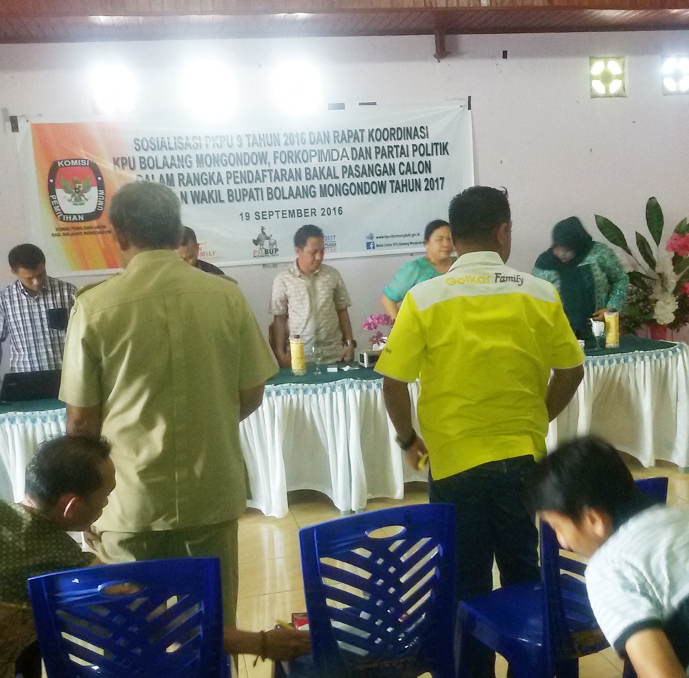 ADVETORIAL, BOLMONG – Komisi Pemilihan Umum (KPU) Bolaang Mongondow (Bolmong) melaksanaan sosialisasi perubahan ketiga atas PKPU No 5 Tahun 2016 menjadi PKPU No 9 Tahun 2016 tentang pencalonan pemelihan gubernur dan wakil gubernur, bupati dan wakil bupati, dan/atau walikota dan wakil walikota.