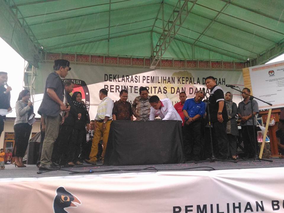 5Acara tersebut dilanjutkan dengan pembacaan naskah deklarasi pilkada berintegritas dan damai dan langsung ditanda tangani oleh masing-masing paslon dan Tim Kampanye disaksikan oleh Ketua dan Anggota KPUD Bolmong, Penjabat Bupati Bolmong dan Kapolres Bolmong.