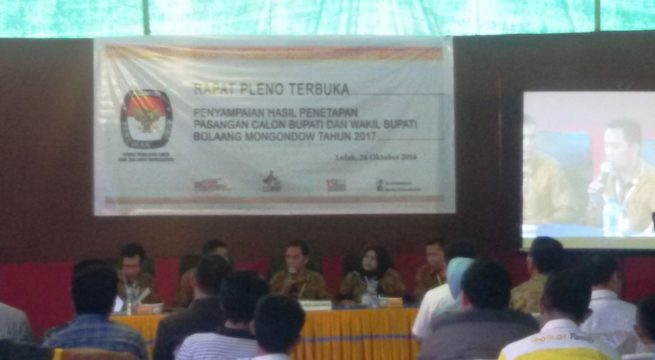 Penetapan pasang bakal calon menjadi calon bupati dan calon wakil bupati itu, dilakukan melalui rapat Pleno terbuka penyampaian hasil penetapan pasangan calon bupati dan wakil bupati 2017 yang dipimpin Ketua KPU Bolmong Fahmi Gobel.