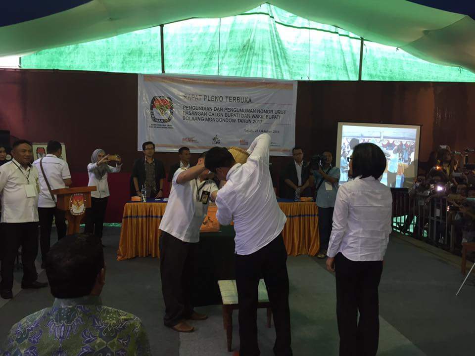 Setelah ditetapkan sebagai pasangan calon Bupati dan Wakil Bupati Bolmong, yang akan melaju ke pemilihan kepala daerah 15 Februari 2017, KPU Bolmong menggelar pencabutan nomor pasangan di kantor Sekretariat KPU di Motabang Lolak Rabu (25/10/2016).