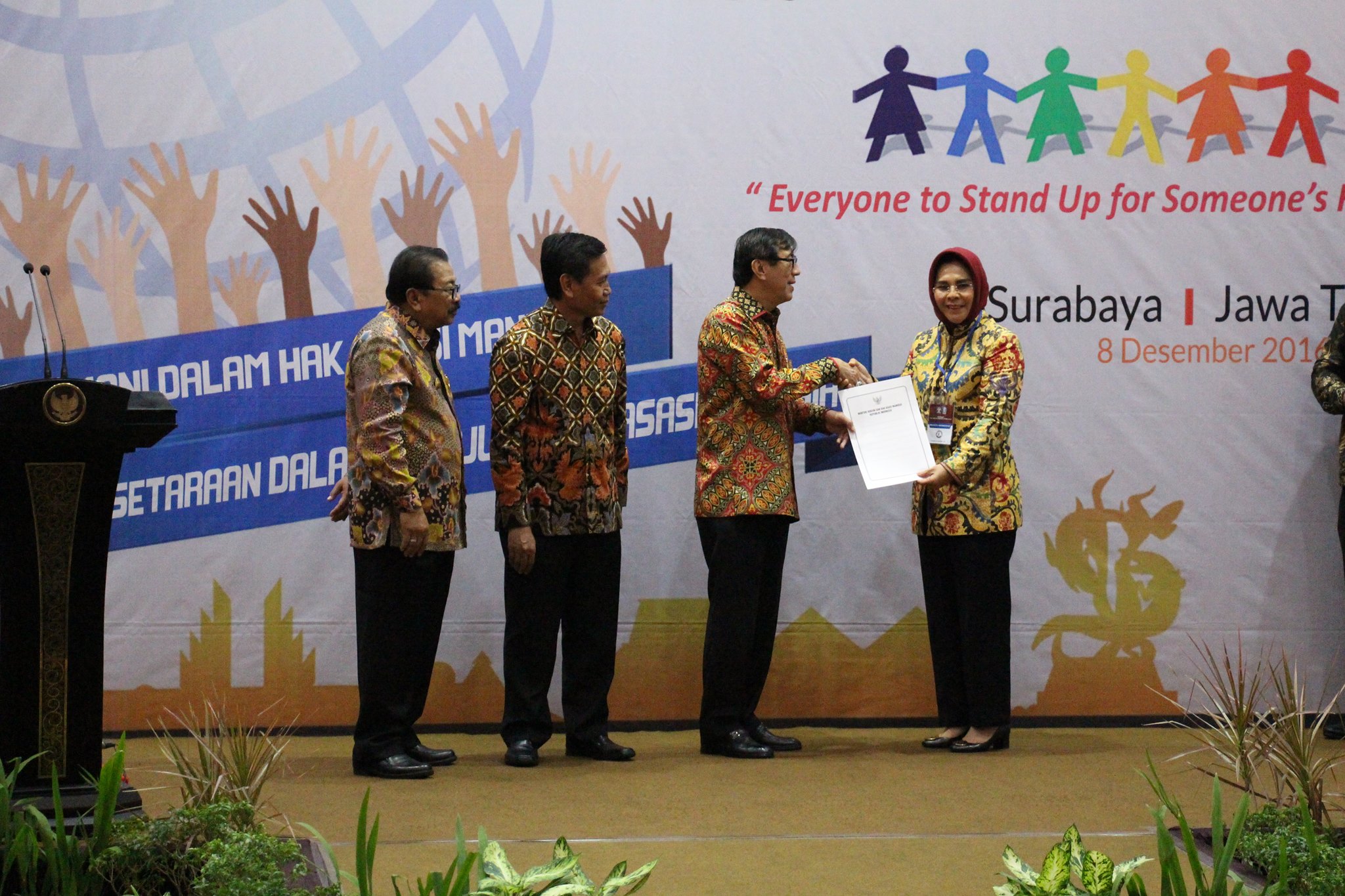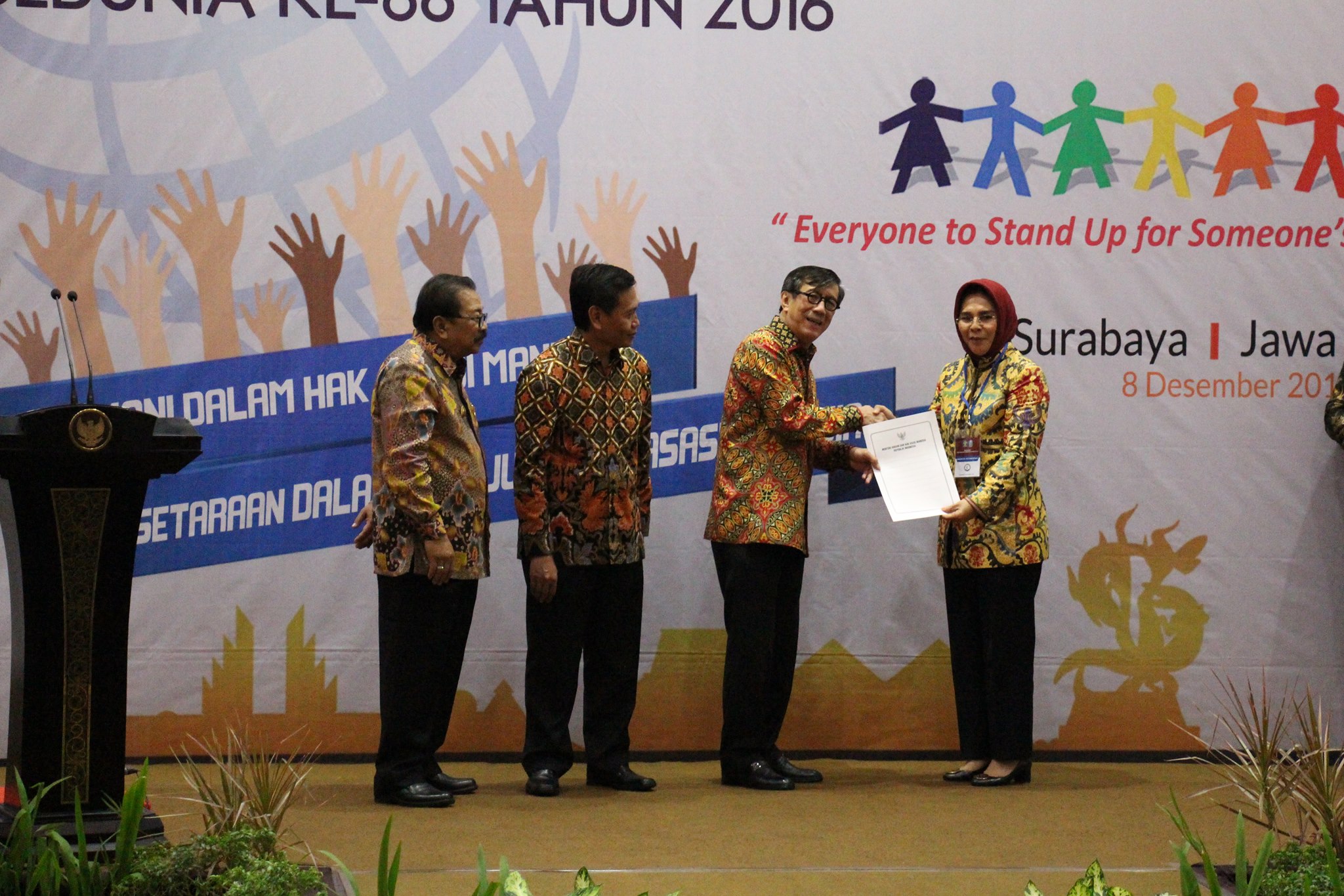 Pemberian penghargaan kepada Kota Kotamobagu sebagai Kota Peduli HAM tersebut, diserahkan secara langsung oleh Menteri Hukum dan HAM Republik Indonesia, Yasonna Laoly, pada puncak Peringatan Hari Hak Asasi Manusia (HAM) se – Dunia ke – 68 Tahun 2016, yang dilaksanakan di Gedung Negara Grahadi – Surabaya.