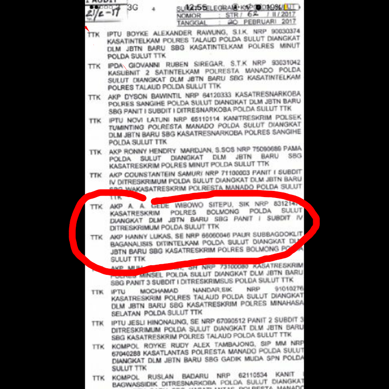 Informasi berhasil dirangkum TOTABUANEWS.COM, berdasarkan dari Surat Telegram (TR), dengan Nomor STR /62/11/2017, tertanggal 20 Februari tahun 2017. Terlampir di surat TR, AKP Hanny Lukas SE, dengan jabatan lama Paur Subbagdoklit Baganalisis Ditintelkam Polda Sulut diangkat dalam jabatan baru sebagai Kasat Reskrim Polres Bolmong Polda Sulut TTK.