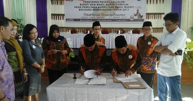 Ketua KPUD Bolmong Fahmi Gobel, mengatakan pleno penetapan pemenag dilakukan setelah pihaknya menerima surat rekomendasi dengan Nomor registrasi 32/PAN.MK/3/2017 tertanggal 13 Maret dari Mahkamah Konstitusi (MK).