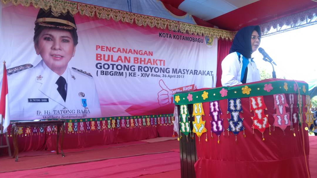 ADVETORIAL, KOTAMOBAGU – Wali Kota, Ir Hj Tatong Bara, secara resmi membuka kegiatan pencanangan Bulan Bhakti Gotong Royong Masyarakat (BBGRM), yang dipusatkan di Lapangan Kelurahan Sinindian Kecamatan Kotamobagu Timur, Rabu (26/04/2017). Kegiatan tersebut, juga digelar bersamaan dengan deklarasi stop buang air besar (BAB) serta pembukaan lomba dalam rangka Hari Ulang Tahun (HUT) Kota Kotamobagu ke-10 pada 23 Mei mendatang.