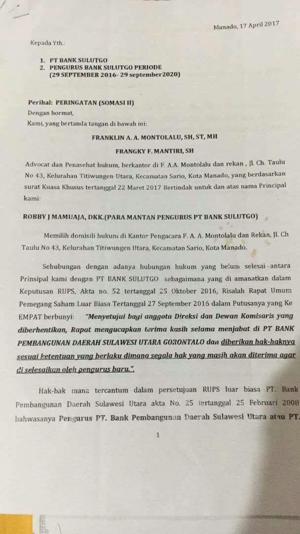 TOTABUANEWS, MANADO – Amanat Rapat Umum Pemegang Saham (RUPS), Bank Sulut Go (BSG) pada tanggal 27 September 2016 yang berisikan penyelesaian hak dari Direksi dan Komisaris lama tak kunjung diberikan.