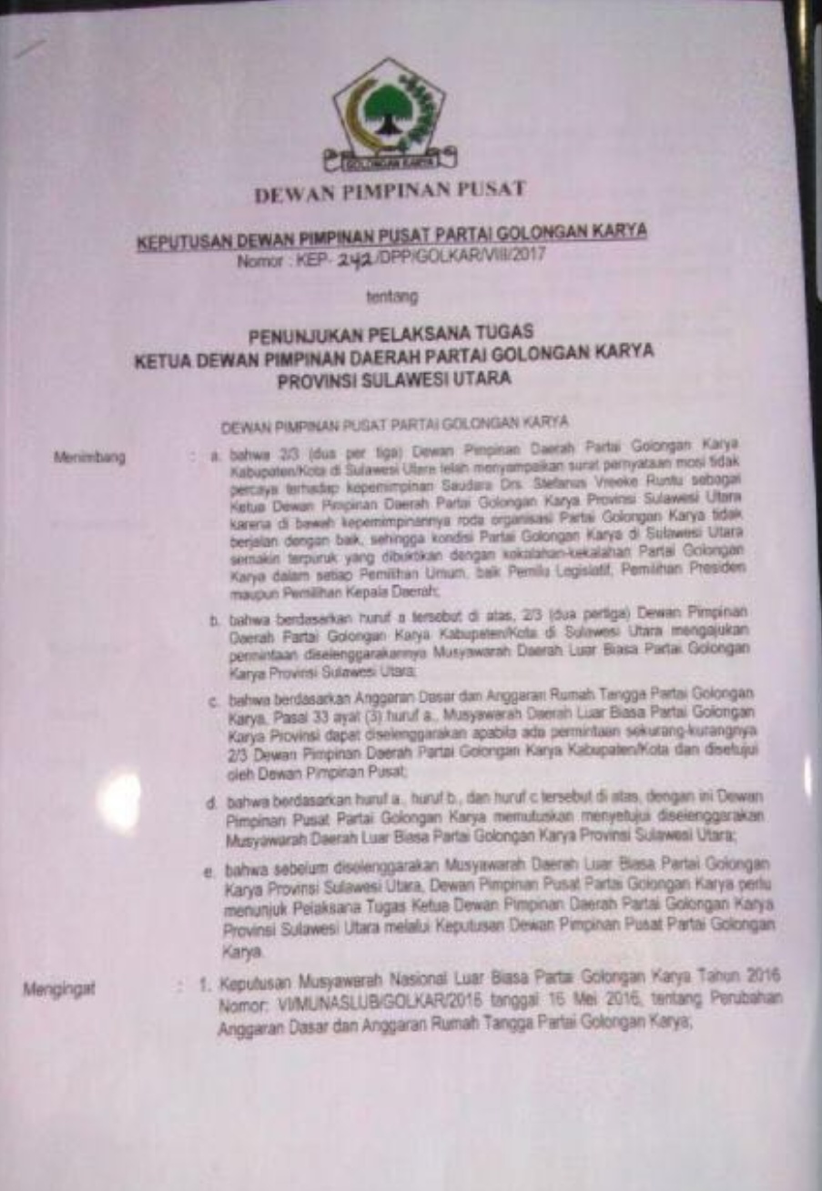 TOTABUANEWS, MANADO – Kembali heboh, Mantan Bupati Minahasa Stefanus Vreeke Runtu ( SVR) dan juga sebagai Ketua DPD I Partai Golkar Sulut kembali digoyang beredarnya surat pemecatan SVR bernomor KEP-242/DPP/GOLKAR/VII/2017 tertanggal 21 Agustus 2017.