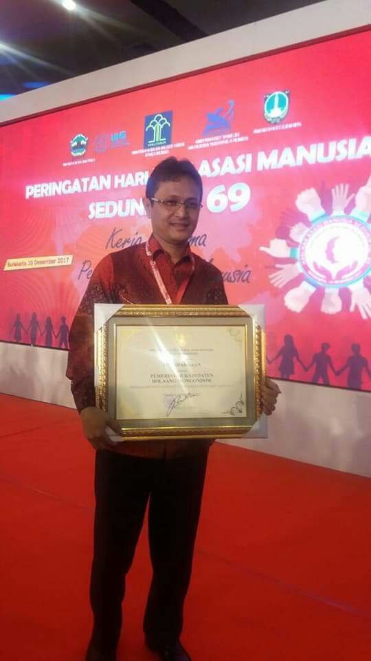 Kali ini Pemerintah Kabupaten (Pemkab) Bolmong meraih penghargaan sebagai daerah sadar Hukum dan Hak Asasi Manusia (HAM) dari Kementrian Hukum dan HAM (KemenkumHAM) bertepatan dengan hari HAM sedunia ke-69 dengan mengangkat tema ‘Kerja Bersama Peduli HAM Untuk Indonesia Maju Sejaterah’, Minggu (10/12/2017). Yang diterima langsung Wabup Yanni, bertempat di Hotel The Sunnan Solo Jawa Tengah.