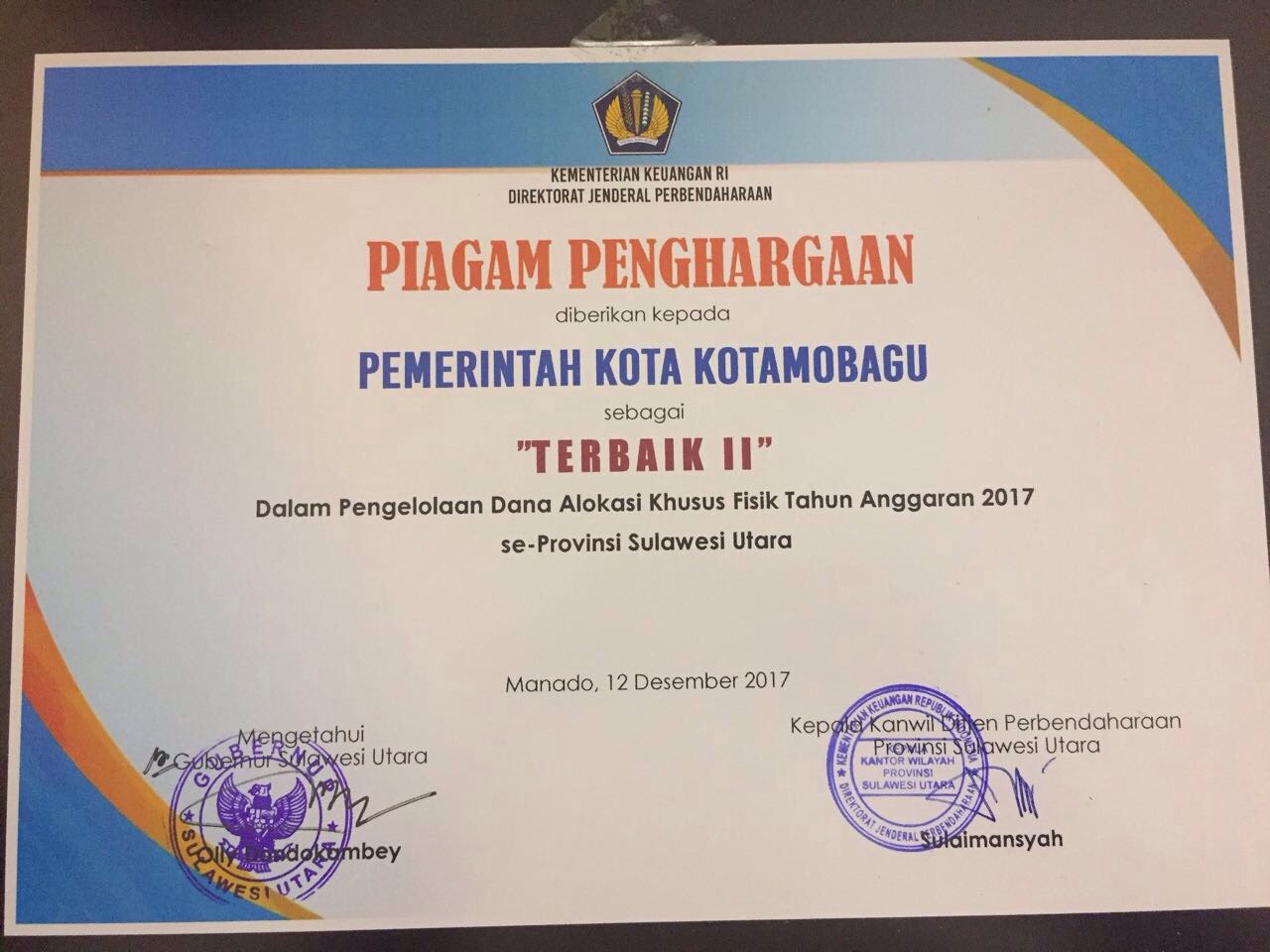 Pada kesempatan itu, Pemerintah Kota (Pemkot) Kotamobagu juga menerima dua penghargaan, yaitu Piagam Penghargaan dari Direktorat Jenderal (Dirjen) Perbendaharaan – Kementerian Keuangan Republik Indonesia, sebagai Terbaik II (dua) dalam pengelolaan Dana Alokasi Khusus (DAK) Tahun Anggaran 2017, se – Provinsi Sulut.