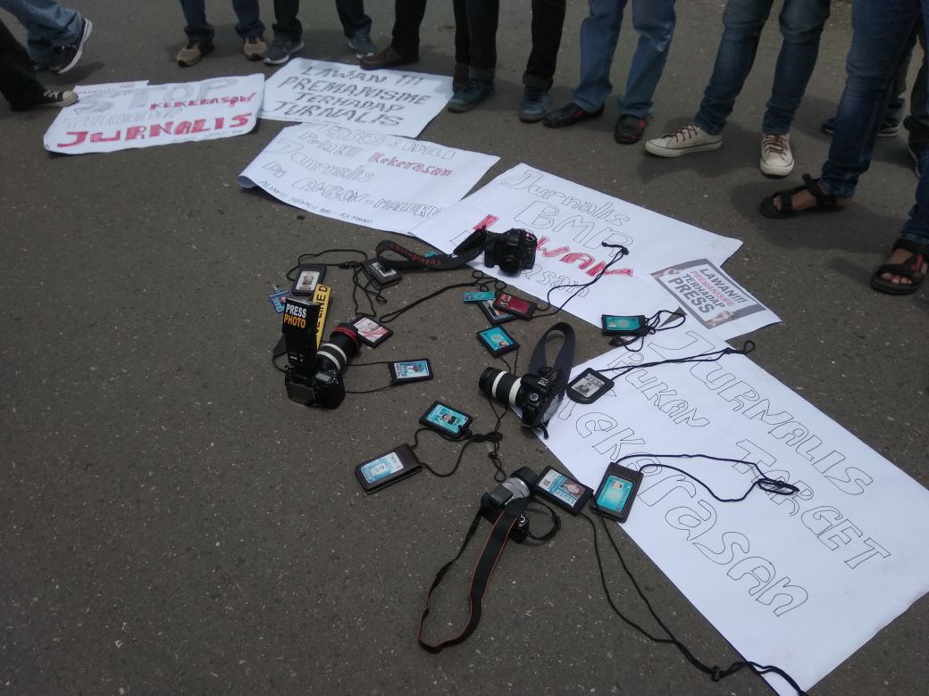 Bentuk protes, juga dilakukan jurnalis BMR dengan melepas atribut kerja, seperti Kartu Pers, Kamera, gadget dan peralatan lain ke aspal, bersamaan dengan poster.