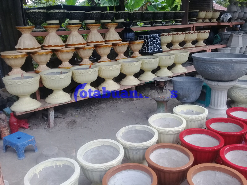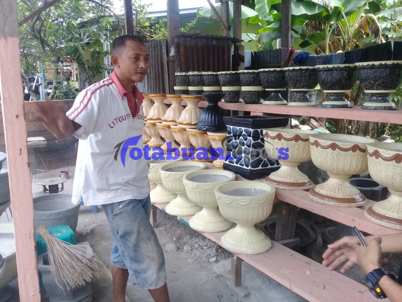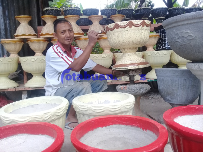 “Bahan bakunya, semen, pasir, cat tembok, serta peralatan berupa tropol dan piso dumpul. Pembuatannya pun masih secara manual, yah Syukurlah dalam sehari bisa memproduksi 12 hingga 20 biji pot dengan omset kurang lebih 400 sampai 500 ribu per hari,” ungkap Papa Fahmi sapaan akrabnya, Selasa (22/05/2018).
