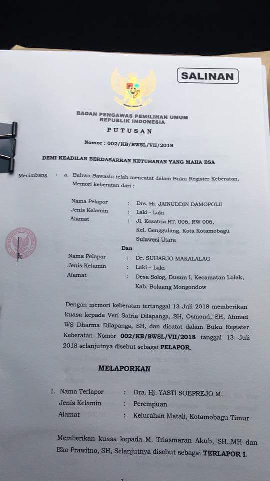 Terpisah, Ketua Tim Pemenangan TBNK Syarifudin Mokodongan saat dikonfirmasi membenarkan adanya putusan Bawaslu RI tersebut. “Iya sudah ada putusan tadi sore di kantor Bawaslu RI Jakarta. Gugatan JaDi Jo ditolak Bawaslu RI,” ujar Syarifudin.