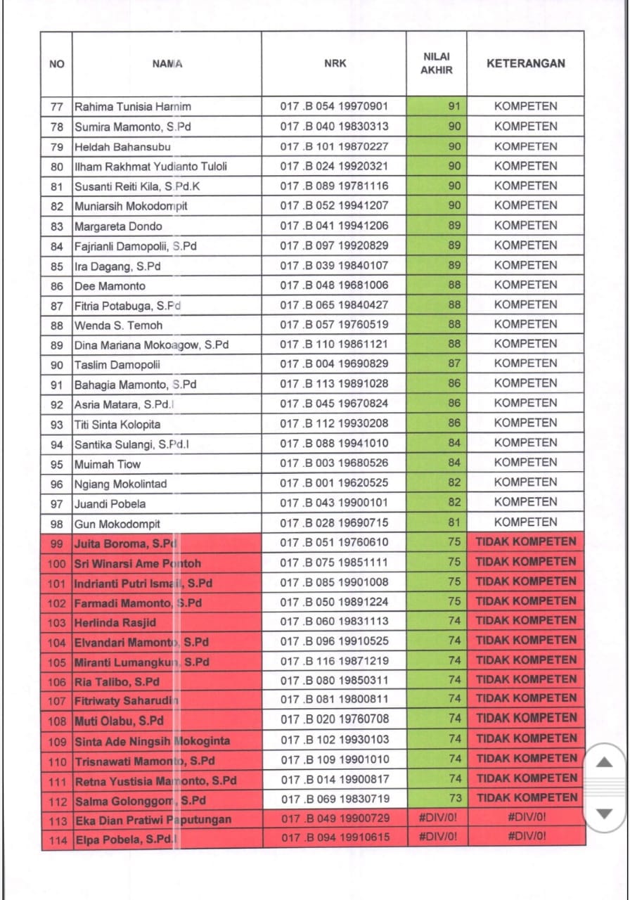 TOTABUAN.NEWS, KOTAMOBAGU – 181 orang guru kontrak yang diseleksi, 23 dinyatakan tidak lulus atau tidak berkompeten untuk dijadikan guru kontrak. Dari 36 guru kontrak TK yang mengikuti ujian, yang lulus sebanyak 34 orang. Sedangkan untuk guru kontrak SD, dari 114 ikut seleksi, yang lulus sebanyak 98, dan guru kontrak SMP yang ikut seleksi sebanyak 31, yang lulus 26 orang.