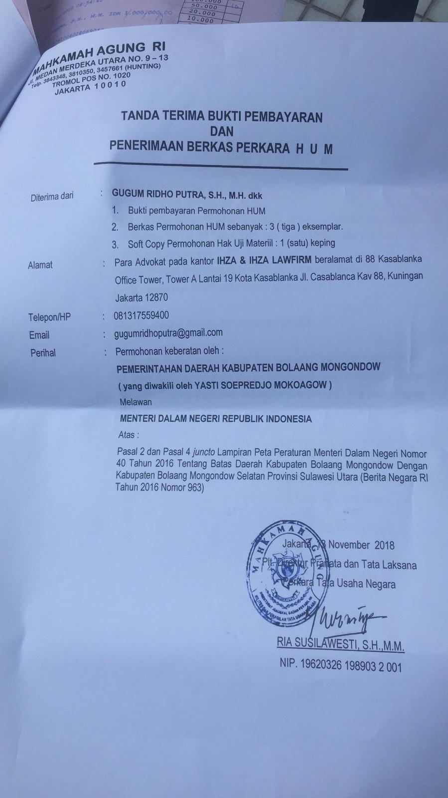 Selasa (13/11/2018) 13, kuasa hukum Pemkab Bolmong dari kantor Ihza & Ihza Lawfirm resmi mendaftarkan JR ke MA untuk menguji keabsahan dari Permendagri Nomor 40 tahun 2016 tentang batas daerah Kabupaten Bolmong dengan Kabupaten Bolsel Provinsi Sulawesi Utara.