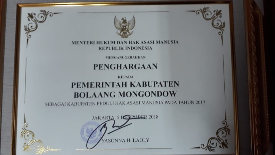 Diketahui, Piagam Penghargaan yang diterima oleh Pemerintah Kabupaten Bolaang Mongondow kali ini diserahkan langsung oleh Menteri Hukum dan HAM RI, Yasonna H Laoly.