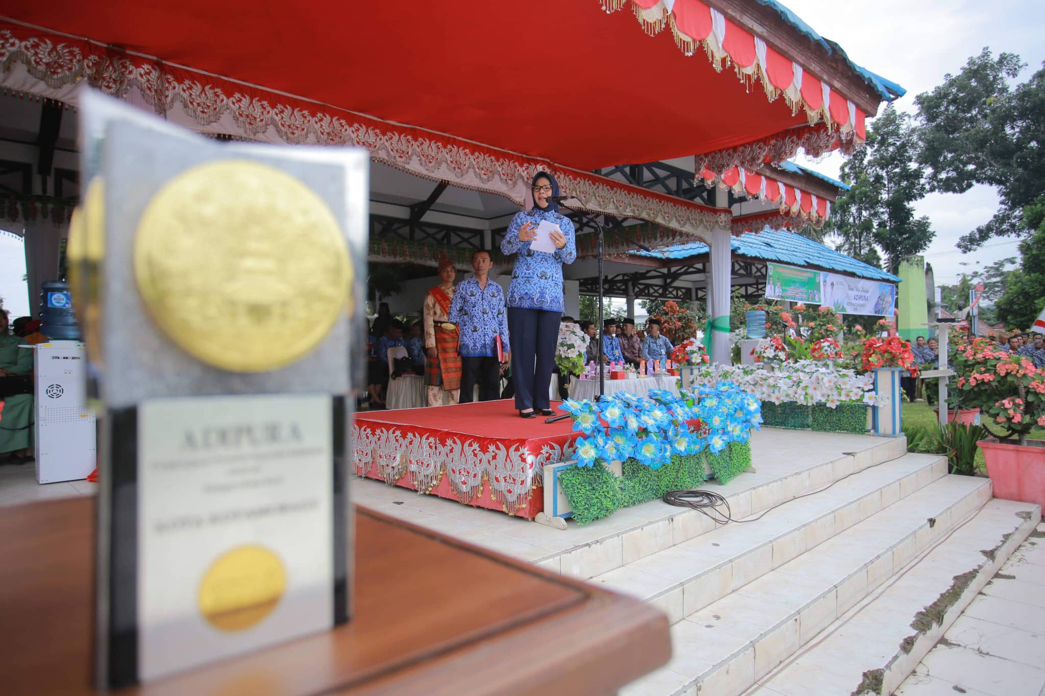 Diketahui, selain penyambutan piala Adipura, upacara Korpri ini juga dirangkaikan dengan pencanangan Pengendalian Sampah Plastik dan Gerakan Jumat Infaq Rp. 1000,00.