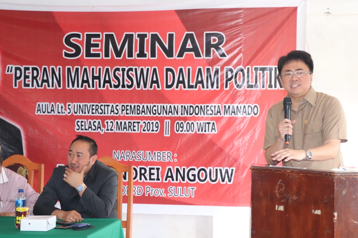 TOTABUAN.NEWS,Manado- Ketua DPRD Provinsi Sulawesi Utara (SULUT) Andrei Angouw, Selasa (12/03/19) siang, menghadiri acara seminar di Universitas Pembangunan Indonesia (UNPI) Kota Manado.