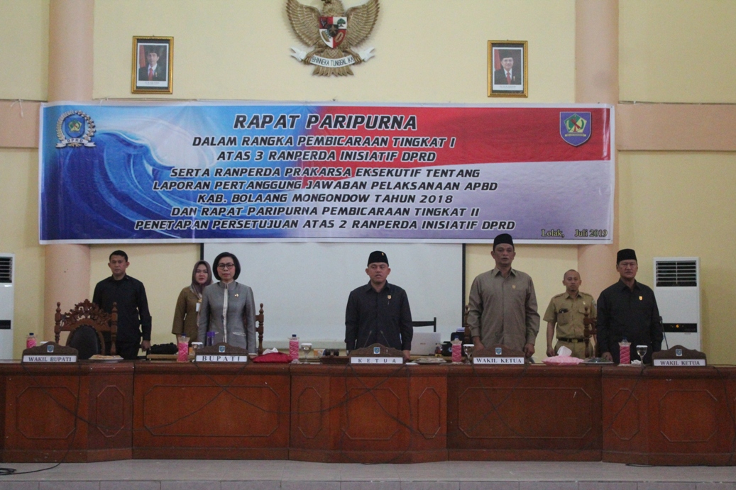 TOTABUAN.NEWS, BOLMONG – Pemerintah Kabupaten Bolaang Mongondow (Bolmong) bersama Dewan Perwakilan Rakyat Daerah (DPRD) Kabupaten Bolaang Mongondow membahas  tiga Ranperda inisiatif DPRD Bolmong yangdirevisi,melalui rapat paripurna DPRD yang dilaksanakan di gedung DPRD Senin 1 Juli 2019.