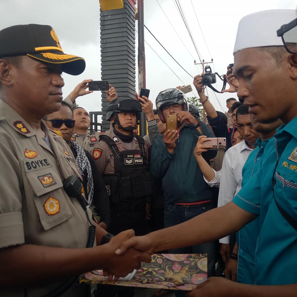 Sementara itu Kapolres Touna mengatakan selaku Kapolres Touna mengucapkan terima kasih kepada saudara saudara saya warga Alkhairat yang sudah mendatangi kami dalam rangka menyampaikan apa yang menjadi tuntutan. “Kami dari Pihak Polres Touna menyatakan yang pertama bahwa apa yang menjadi tuntutan dari saudara saudaraku warga Alkhairat, Kami menerima tuntutan tersebut,” katanya.