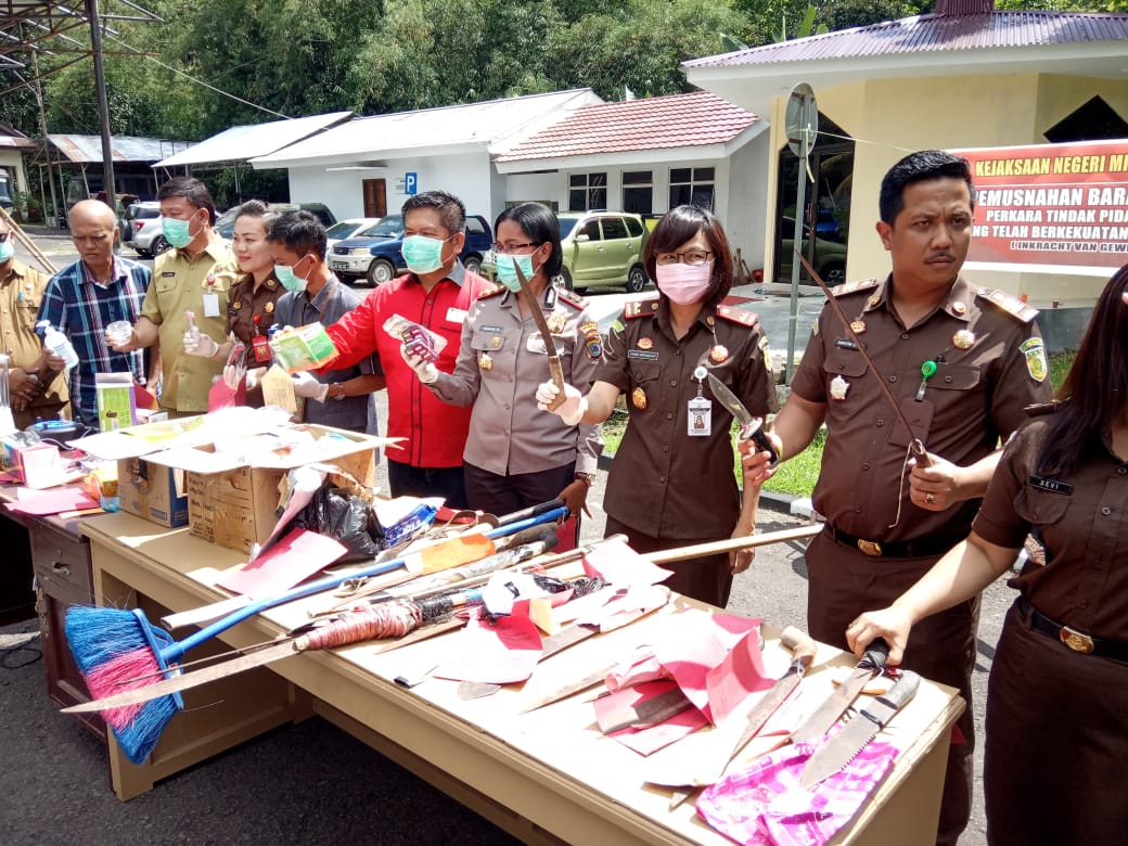 Kajari ketika menjelaskan pelaksanaan pemusnahan ini mengatakan, eskalasi kasus yang paling banyak ditangani di Minut adalah Kasus penganiayaan dengan Senjata Tajam (Sajam) dengan pengenaan pasal 351 dan 170 KUHP (Kitab Undang-Undang Hukum Pidana).