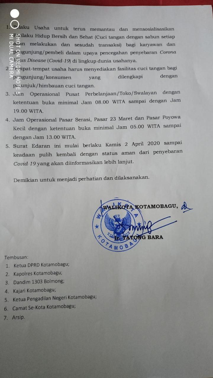 Dalam isi surat edaran tersebut dijelaskan, dunia usaha sebagai salah satu pusat transaksi dan interaksi masyarakat, yang masuk kategori rawan penyebaran Covid-19 serta, dengan telah ditetapkannya Status Siaga Darurat Bencana Corona Wrus Disease (Covid-IQ) di Kota Kotamobagu, berdasarkan Keputusan Walikota kotamobagu Nomor 170 Tahun 2020 dan Maklumat KAPOLRI Nomor Mak/2/m/2020 tentang Kepatuhan Terhadap Kebijakan Pemerintah Daerah Dalam Penanganan Penyebaran Comm Virus Usease (Couid-I 9), maka perlu ada tindakan preventif dalam upaya memutus mata rantai penyebaran Couid-19, untuk itu bersama ini disampaikan beberapa hal sebagai berikut :