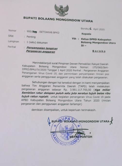 TNews, BOLMUT – Anggota Dewan Perwakilan Rakyat Daerah (DPRD) Kabupaten Bolaang Mongondow Utara (Bolmut) mendesak Pemerintah Kabupaten (Pemkab) Bolmut, untuk kembali melakukan pergeseran anggaran sesuai arahan dari Pemerintah Pusat dan Gubernur Sulut dalam penanganan pandemi Virus Desease atau Covid-19.