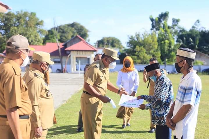 Kegiatan Apel Kerja Bersama diawali dengan penyerahan simbolis Surat Pemberitahuan Pajak Terhutang (SPPT) PBB-P2 dan DHKP Tahun 2020 dan Penyaluran BLT Dana Desa Bulan Juni di Kecamatan Bolangitang Barat.