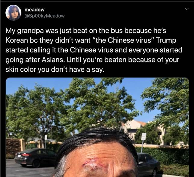 “Kakekku baru saja ditabrak dengan bis karena dia Korea dan mereka nggak mau melihat ‘si virus china’ seperti yang sering dibicarakan oleh Trump dan membuat setiap orang menyoroti setiap orang-orang Asia,” cuitnya.
