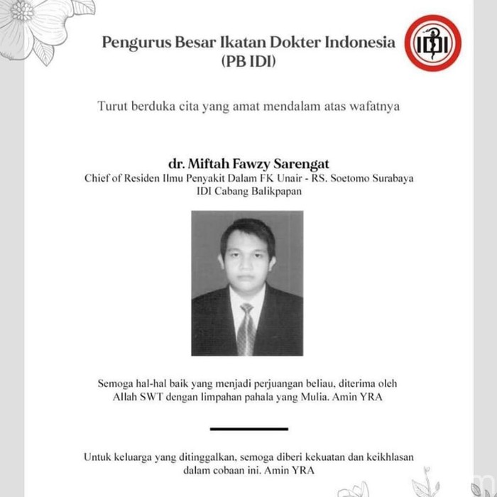 “Miftah kemudian dirawat di RS Swasta tempat istrinya bekerja. Karena keluhannya semakin berat, akhirnya dirujuk ke RSU dr Soetomo dan sudah kita upayakan plasma convalescent. Tetapi kondisinya memang berat komorbidnya juga berat, kita sudah berusaha tapi tuhan berkehendak lain, kemarin pagi meninggal. Dimakamkan di Magetan,” jelasnya.