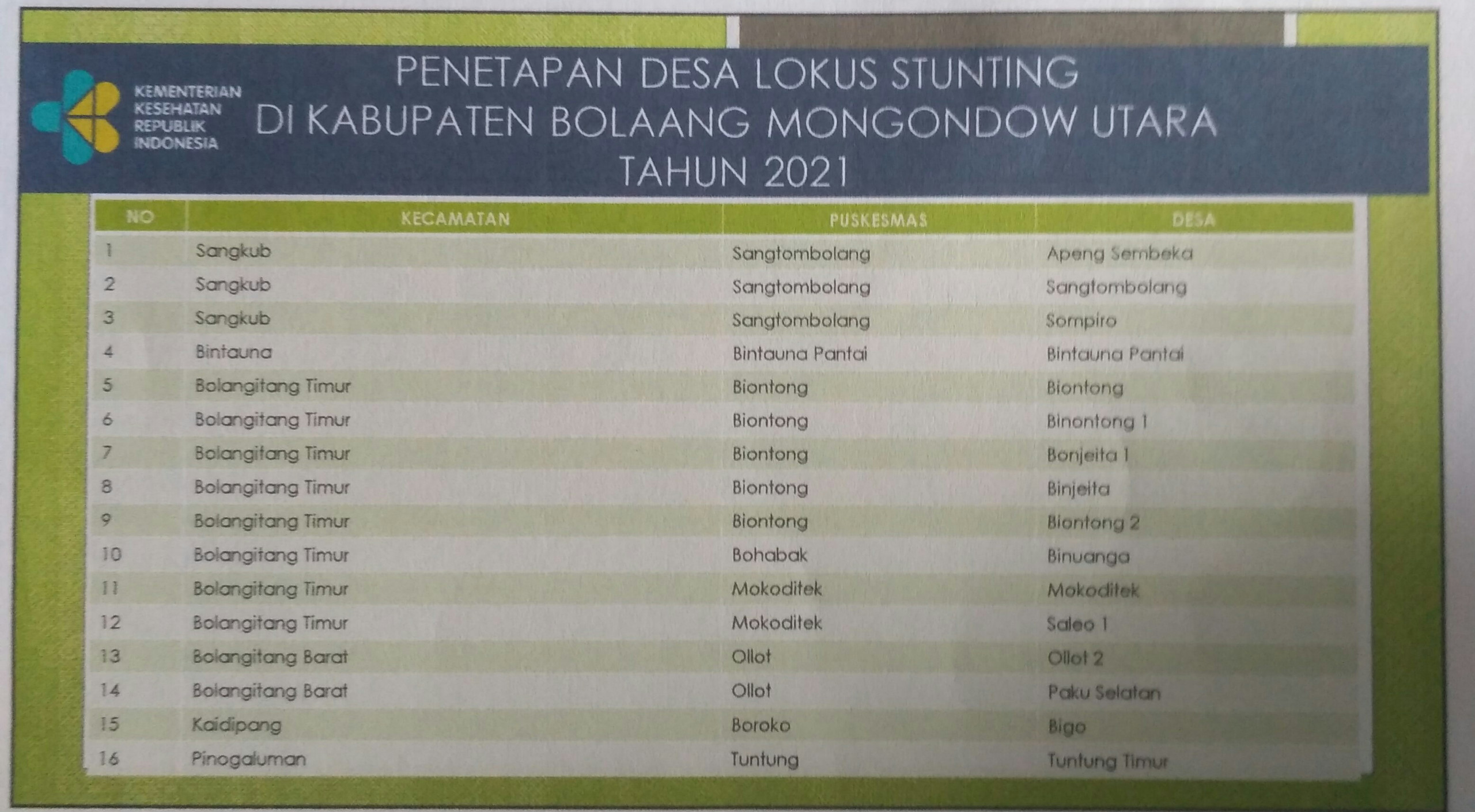 16 Desa di Kabupaten Bolmut Lokus Stunting Tahun 2021.