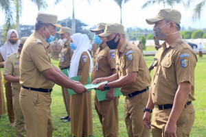 TNews, BOLMUT – Bupati Bolmut Drs. Hi. Depri Pontoh didampingi Wakil Bupati Drs. Hi. Amin Lasena, M.AP dan Sekretaris Daerah Dr. Drs. Hi. Asripan Nani, M.Si menyerahkan Surat Keputusan (SK) Pelaksana Tugas (Plt) kepada 2 (dua) orang Pejabat Tinggi Pratama Kabupaten Bolmut pada Apel bersama ASN yang bertempat di Halaman Kantor Bupati Bolmut Senin (06/7/2020).