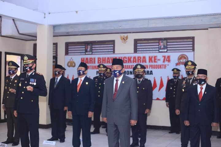 TNews, BOLMUT – Peringatan Hari Bhayangkara ke-74 diperingati secara sederhana tahun 2020 ini. Pelaksanaannya dilakukan secara Video Conference (VICON) dipimpin langsung oleh Presiden RI Ir.Joko Widodo dari Istana Negara. Jajaran Polres Bolmong Utara (Bolmut) mengikuti upacara Hari Bhayangkara ini di Aula Mapolres, Rabu (01/07/2020) .