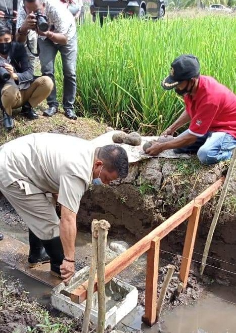 Advertorial, KOTAMOBAGU – Wakil Walikota Kotamobagu, Nayodo Koerniawan, melakukan peletakan batu pertama pembuatan saluran irigasi di Kelurahan Motoboi Kecil, (Motcil), Senin, (31/08/2020).