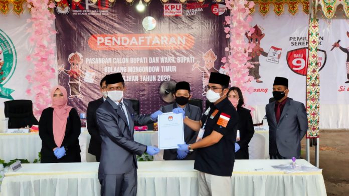 TNews, BOLTIM – Hari ke dua pembukaan pendaftaran Bakal pasangan calon (Bapaslon) Bupati dan Wakil Bupati Bolaang Mongondow Timur (Boltim), pasangan Amalia R. Landjar dan Uyun K. Pangalima menyerahkan dokumen-dokumen persyaratan pendaftaran ke Komisi Pemilihan Umum (KPU) Kabupaten Boltim.