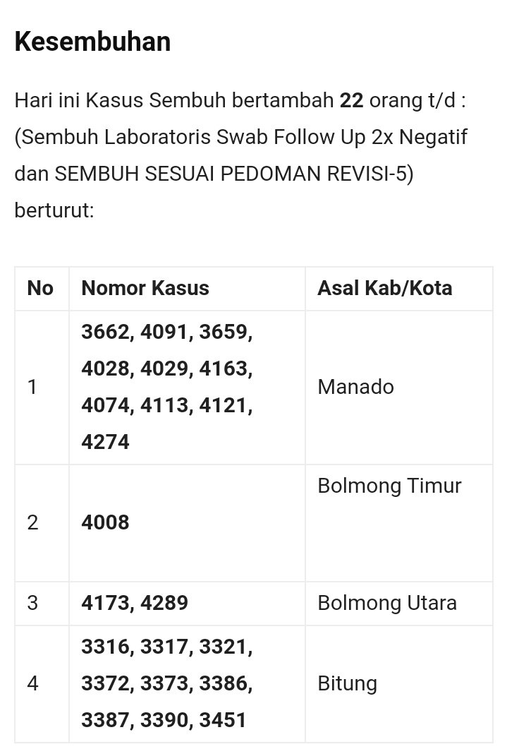 Disampaikan juga Dandel, untuk hari ini juga ada dua pasien terkonfirmasi Postif Covid-19 di Kabupaten Bolmut sembuh dari Covid 19, yakini nomor kasus 4173 dan 4289.