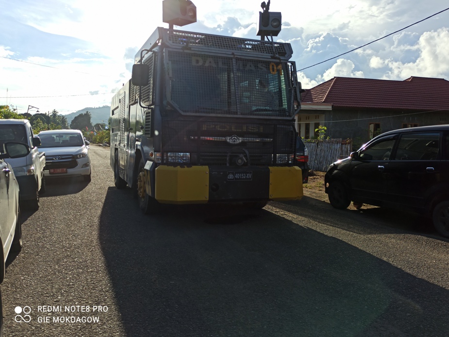 Berdasarkan pantauan tim media siber totabuan.news pihak kepolisian dilengkapi dengan 1 unit mobil pengendali masa disiapkan menjaga ketat pintu masuk hingga jalan di depan Kantor KPU Bolsel.