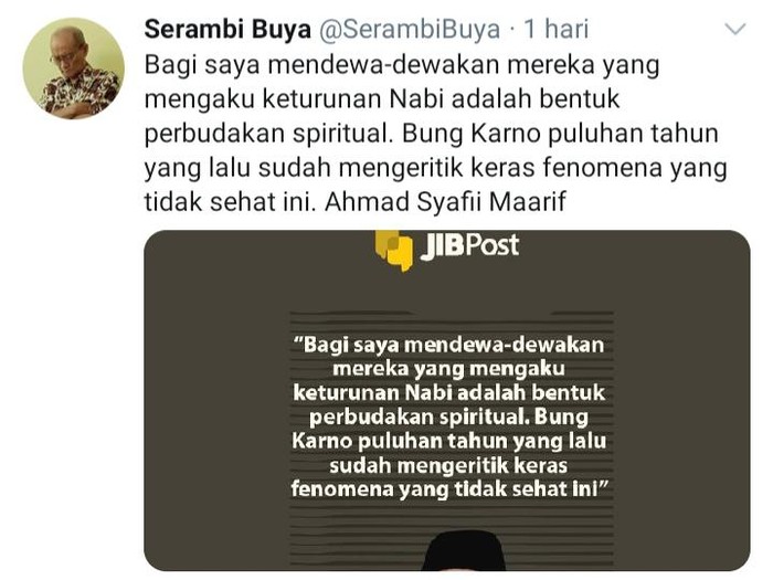 “Bagi saya mendewa-dewakan mereka yang mengaku keturunan Nabi adalah bentuk perbudakan spiritual,” tulis akun Twitter @SerambiBuya seperti dikutip, Senin (23/11/2020).