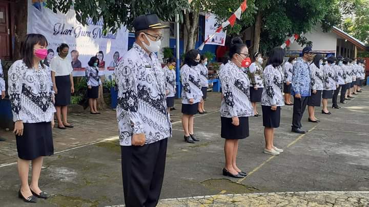 TNews, Minut – Peringatan Hari guru dilaksanakan Pemerintah Kabupaten Minahasa Utara, Kamis (26/11/2020) di SMP 1 Kalawat dengan melakukan upacara bendera.