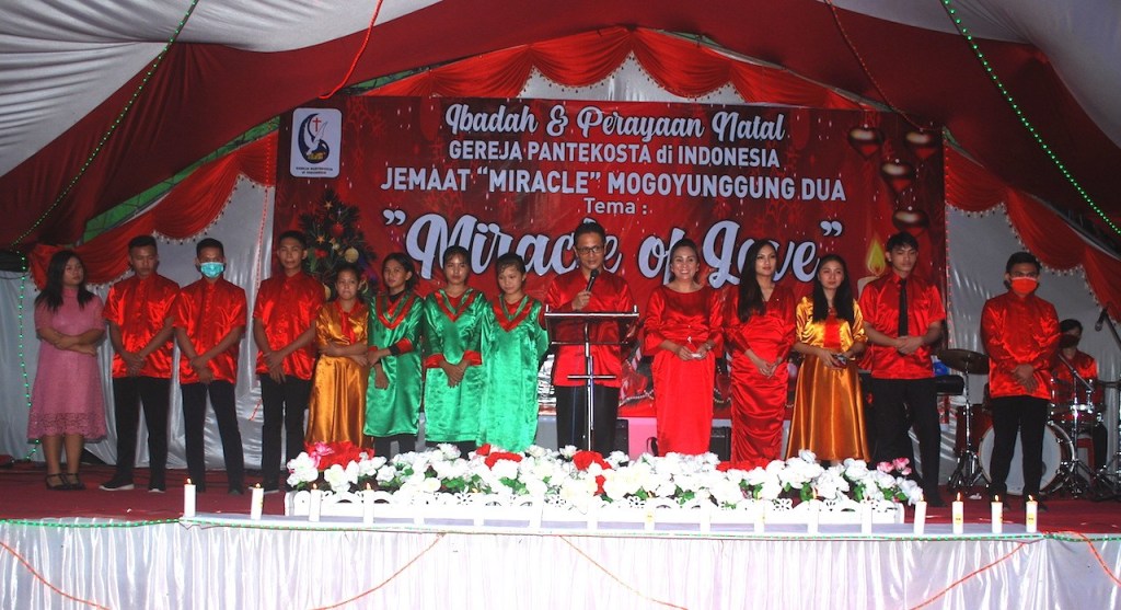 Mulai dari pintu masuk, para undangan diwajibkan memakai masker, mencuci tangan dan diperiksa suhu tubuh oleh panitia, jumlah juga dibatasi. Tak hanya itu, ada juga sarung tangan plastik dan masker yang dibagikan kepada jemaat dan undangan, dengan tempat duduk di atur jarak minimal satu meter. Ibadah Pra Natal tersebut bertema : Miracle of Love, yang mengangkat Ayat dalam Alkitab Yohanes 3:16 ‘Karena begitu besar kasih Allah akan dunia ini, sehingga Ia telah mengaruniakan Anak-Nya yang tunggal, supaya setiap orang yang percaya kepada-Nya tidak binasa, melainkan beroleh hidup yang kekal’.