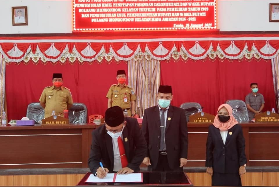 TNews, BOLSEL – Dewan Perwakilan Rakyat Daerah (DPRD) Kabupaten Bolaang Mongondow Selatan (Bolsel) sukses menggelar rapat paripurna pemberhentian Bupati dan Wakil Bupati Bolsel Masa Jabatan 2016-2021 dan pengumuman penetapan Calon Bupati (Cabup) dan Calon Wakil Bupati (Cawabup) Terpilih periode 2020 -2025. Senin (25/01/2021) di ruang Aula DPRD Bolsel.