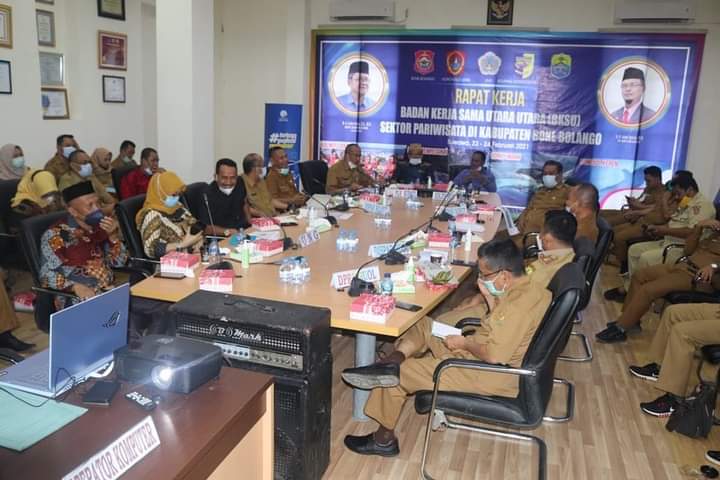 TNews, BOLMUT– Pemerintah Kabupaten (Pemkab) Bolaang Mongondow Utara (Bolmut) Selasa (23/02/2021), bertempat di Kantor Pemkab Bone Bolango Provinsi Gorontalo, menghadiri Rapat Kerja (Raker) program Badan Kerjasama Utara-Utara (BKSU), khususnya di bidang sektor pariwisata.