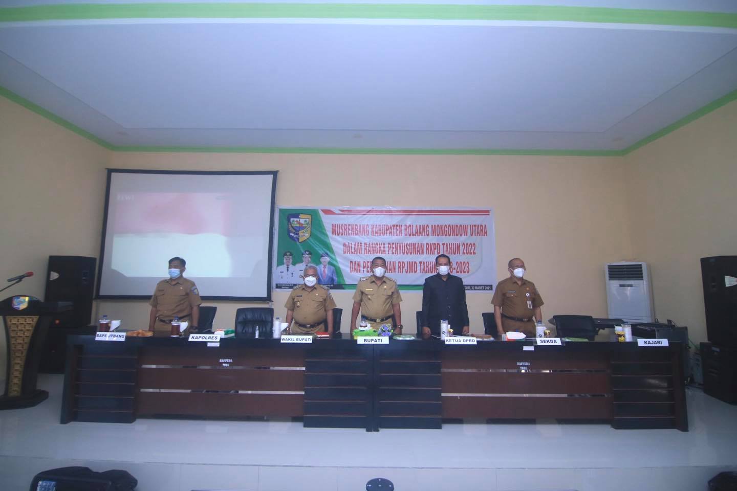 TNews, BOLMUT — Bupati Bolaang Mongondow Utara (Bolmut) Drs. Hi. Depri Pontoh membuka secara resmi Musrenbang tingkat Kabupaten Bolaang Mongondow Utara tahun 2021 dalam rangka Penyusunan RKPD Tahun 2022 dan perubahan RPJMD Tahun 2018-2023 yang bertempat di Aula kantor Bapelitbang. Senin (22/03/2021).