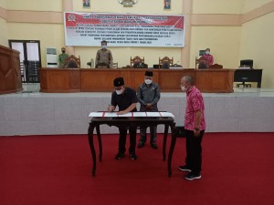 ADVETORIAL, BOLMONG — Rapat Paripurna Dewan Perwakilan Rakyat Daerah (DPRD) Kabupaten Bolaang Mongondow (Bolmong) dalam rangka Pembicaraan Tingkat I Penyampaian atas Rancangan Peraturan Daerah (Ranperda) inisiatif DPRD tentang pedoman pengelolaan Barang Milik Daerah (BMD) dan Ranperda usulan Eksekutif tentang pencegahan dan pengendalian Covid-19 serta Rapat Paripurna penyampaian Laporan Keterangan Pertanggunhjawaban (LKPJ) Bupati tahun 2020 dan penyampaian hasil Reses masa sidang I tahun 2021 sukses digelar, Kamis (22/04/2021).