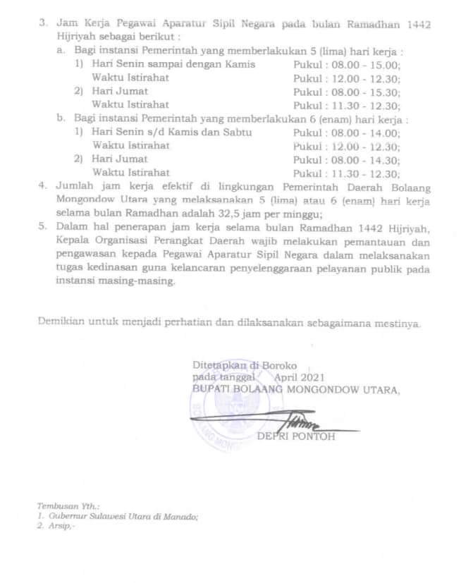 Dijelaskan juga Sekda Bolmut, dalam rangka pelaksanaan tugas kedinasan pada bulan Ramadhan 1442 H dan dengan tetap memperhatikan pengendalian penyebaran Coronavirus Disease (Covid-19) di lingkungan instansi Pemkab Bolmut maka perlu dilakukan penyesuaian jam kerja bagi ASN.