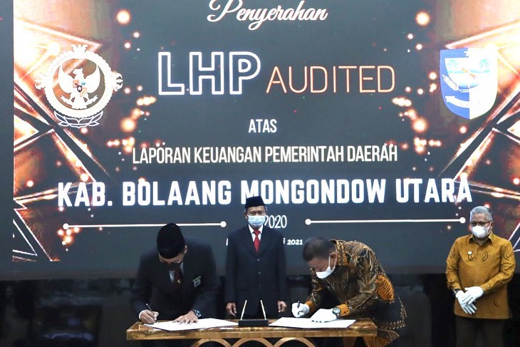 Penyerahan Laporan Hasil Pemeriksaan (LHP) Audited diserahkan langsung oleh Auditor Utama Keuangan Negara VI BPK RI, Dr. Dori Santosa, S.E., M.M., CSFA, kepada Bupati Bolmut Drs.Hi.Depri Pontoh, yang didampingi Wakil Bupati Bolmut Drs.Hi.Amin Lasena, M.AP dan Ketua DPRD Bolmut Frangky Chendra, bertempat di Auditorium Gedung BPK Perawakilan Sulut, Senin (3/4/2021).